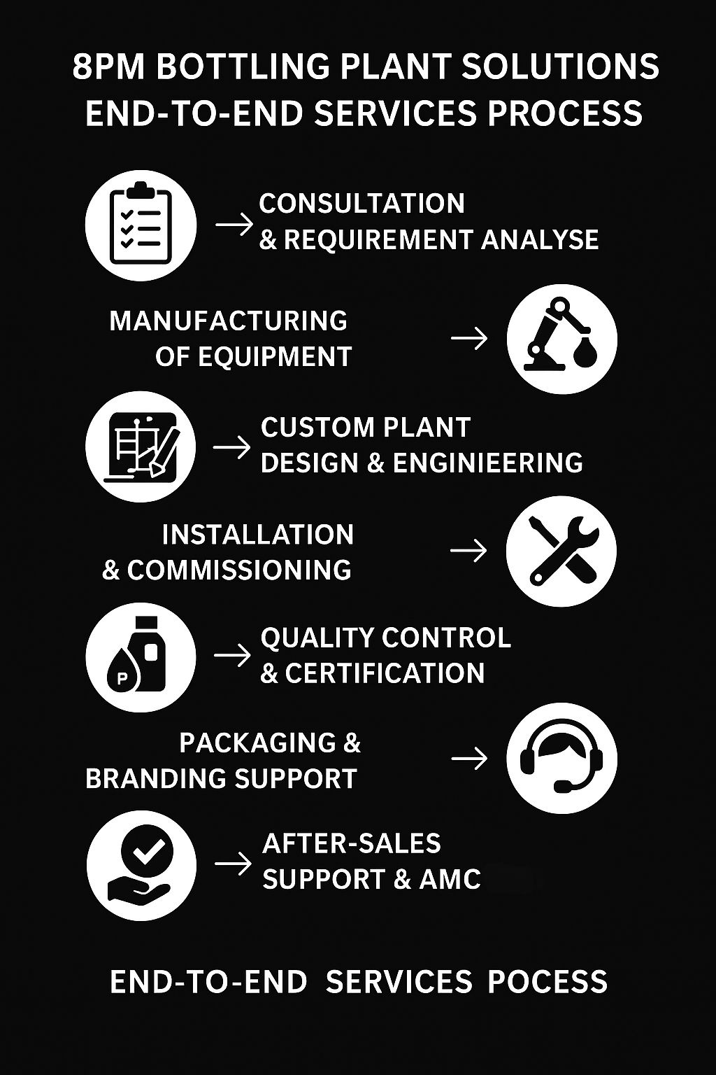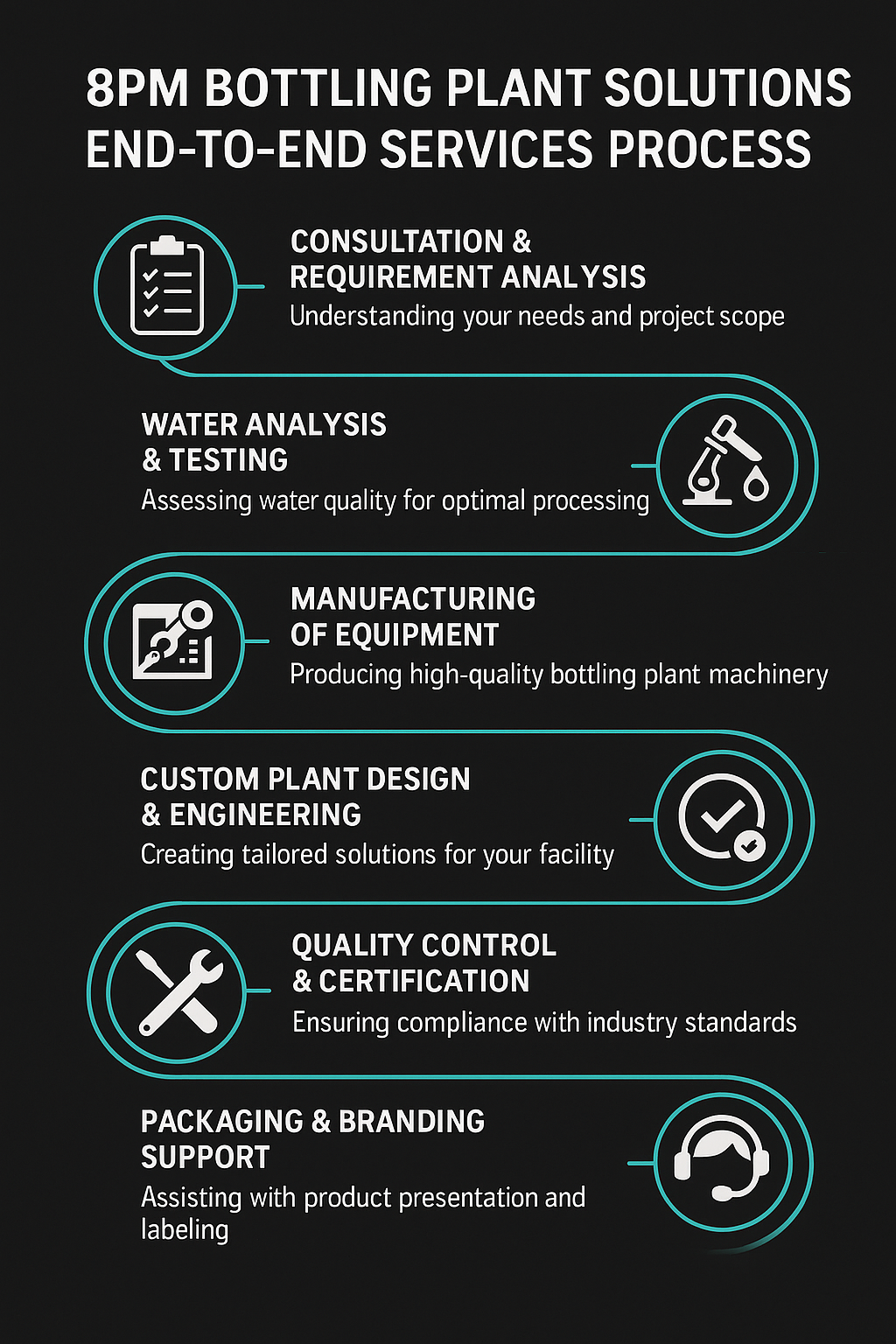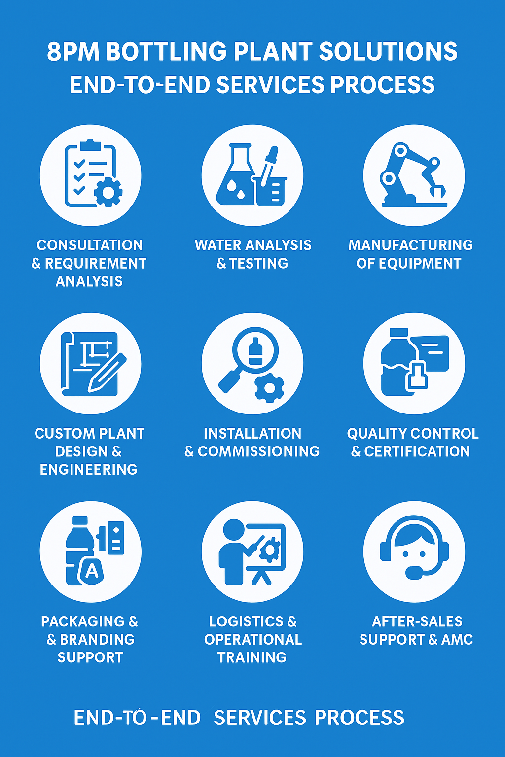 At 8PM, we provide complete turnkey solutions for water and soda bottling plants—starting from consultation and water testing, to custom plant design, high-performance equipment manufacturing, seamless installation, and automation. Our expertise covers everything from quality control to packaging and logistics, ensuring your production is smooth, efficient, and future-ready. With a strong focus on quality, innovation, and customer satisfaction, we empower businesses to grow with confidence and deliver purity in every bottle.
