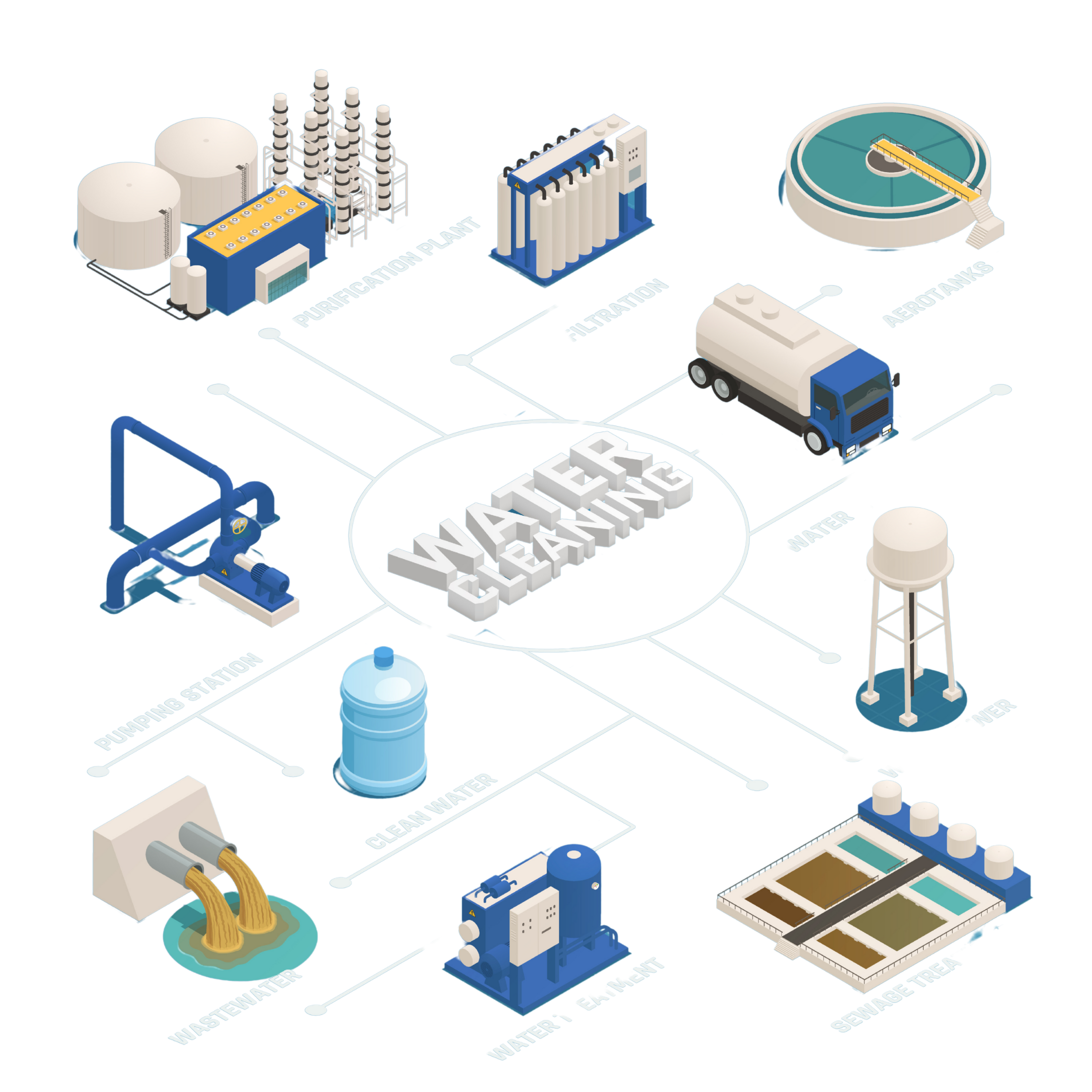 From wastewater collection to clean water delivery, the system showcases the full journey of water purification and reuse. Steps like filtration, aerotanks, water treatment, and sewage treatment ensure removal of contaminants and safe water production. Features such as pumping stations, water trucks, and water towers demonstrate a well-connected supply and storage network. The process concludes with safe, purified water ready for bottling or distribution, emphasizing reliability and hygiene.